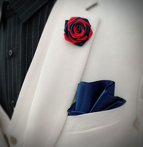 當然,小小的口袋巾也可以成為整套西服的點睛之筆,除了在顏色上要選擇與領(lǐng)帶色系一致外,還可以選擇一些有趣的圖案,或者和新娘身上禮服形成呼應的顏色!