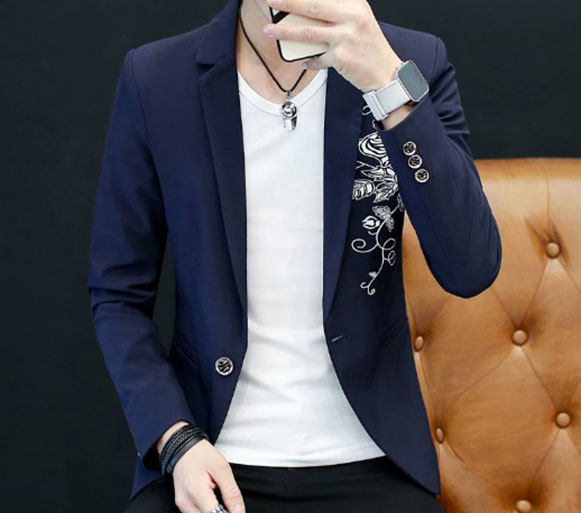 西服是結(jié)構(gòu)相對規(guī)范的服裝品類,要體現(xiàn)伙伴們脾性偏好是比較難的。除了在扣子、兜、開衩等基本的變化外,還可以從里料選擇以及刺繡、印花、拼色等工藝變化。