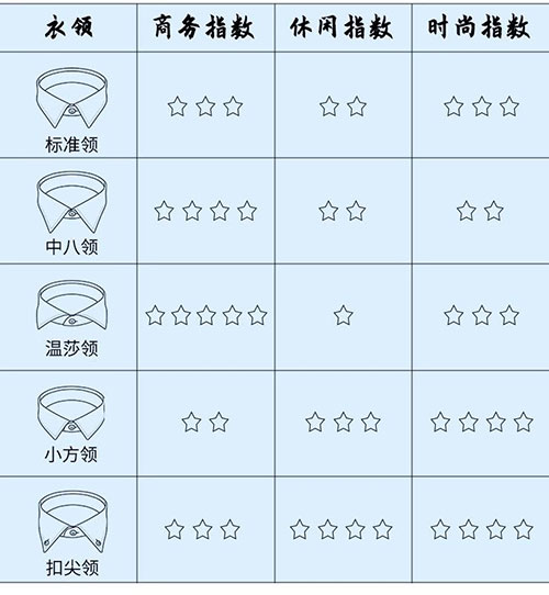 襯衫的最常見的領型一般有標準領、中八領、溫莎領、小方領、扣尖領。