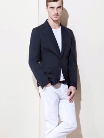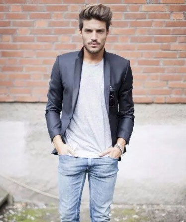 3、休閑西裝外套+淺色t恤+水洗牛仔褲。這是比較輕松休閑的搭配方式,內(nèi)穿淺色t恤,搭配一條水洗牛仔褲,外套深色休閑西裝外套,適合春秋時節(jié)穿著。