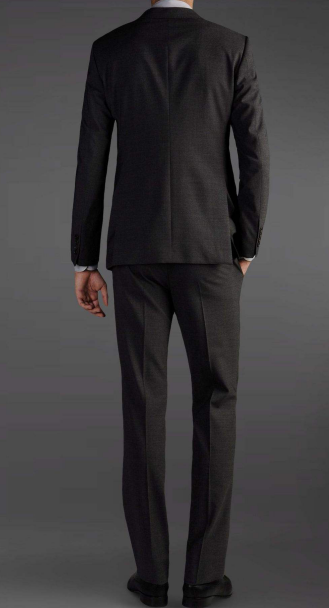 西服開單衩通常采用后中開衩:又叫騎馬衩,是在西服后背中縫腰線以下開的10多厘米長的縫。是源于英國貴族騎馬時免衣服后面下部擠壓折褶而開的后衩款式。如下圖為開單衩西服。