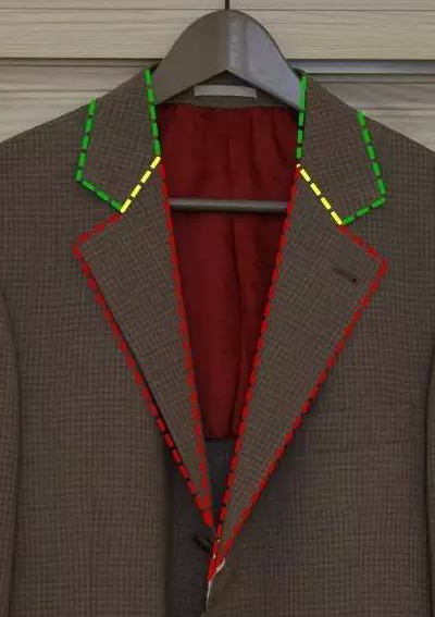 平駁領:平駁領英文名叫Notched Lapel,直譯為“有缺口的翻領”。平駁領通常是屬于鈍領的一種,其領子的下半片和上半片通常有一個夾角。如下圖,紅色虛線內區域為駁頭(Lapel),綠色虛線內為翻領(Collar),在黃線處二者縫合在一起,并形成一個V字缺口,這個V字缺口就是平駁領的關鍵特征。