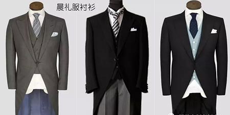 禮服款襯衫包括晚禮服和日間禮服,其中晚禮服襯衫一般搭配領結,日間禮服可以搭配領巾或領帶,其中領帶多以素灰色為主色調,可以是純灰或灰色條紋(褲子多為黑灰相間的條紋面料),如果晨禮服的外套為藏青色,也可以配近似顏色的領帶。